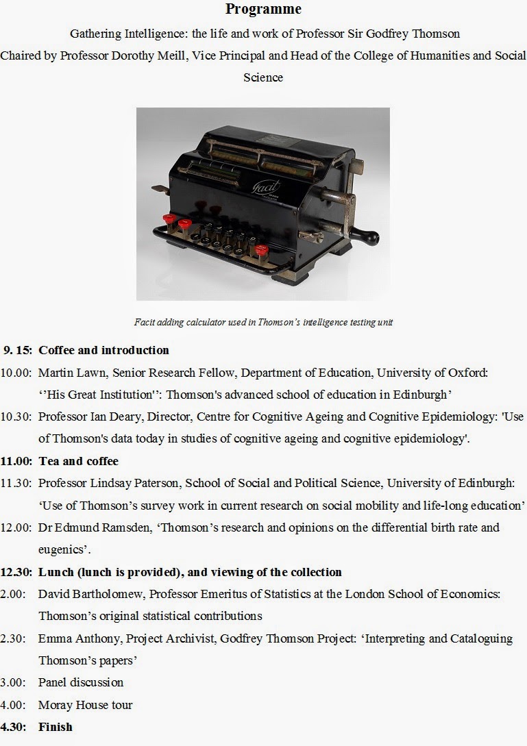 To mark our Wellcome Trust funded project, ‘Documenting the Understanding of Human Intelligence’*, which aims to catalogue and preserve the papers of educator and psychologist Professor Sir Godfrey Thomson (1881-1955), Edinburgh University archives and special collections are holding a free seminar at Edinburgh University Library, 16th May 2014.